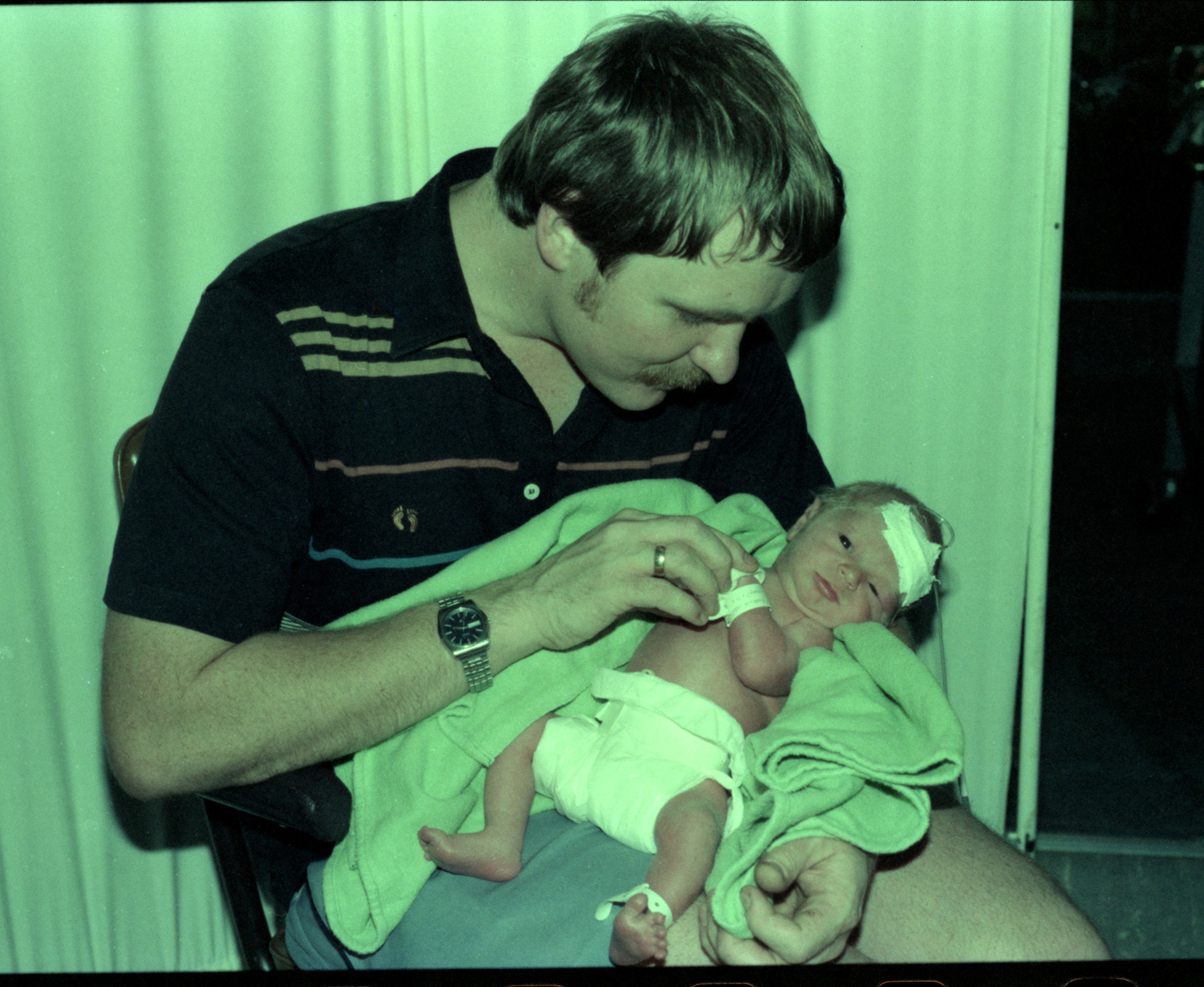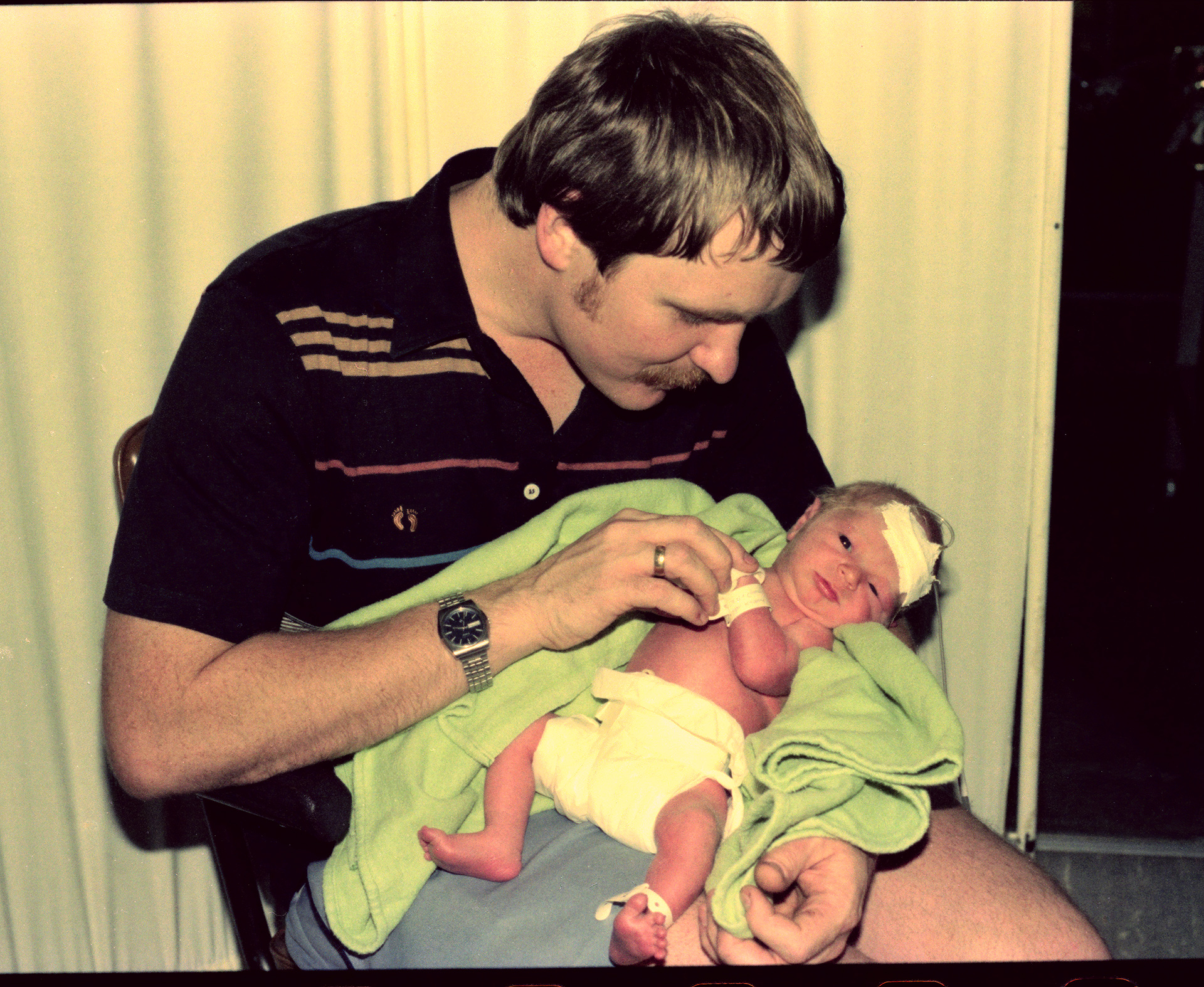 The joy of fatherhood October 1979. I've scanned colour negatives. Really battle with colour correction as some colours faded more than others. So long ago, perhaps we looked like that back then