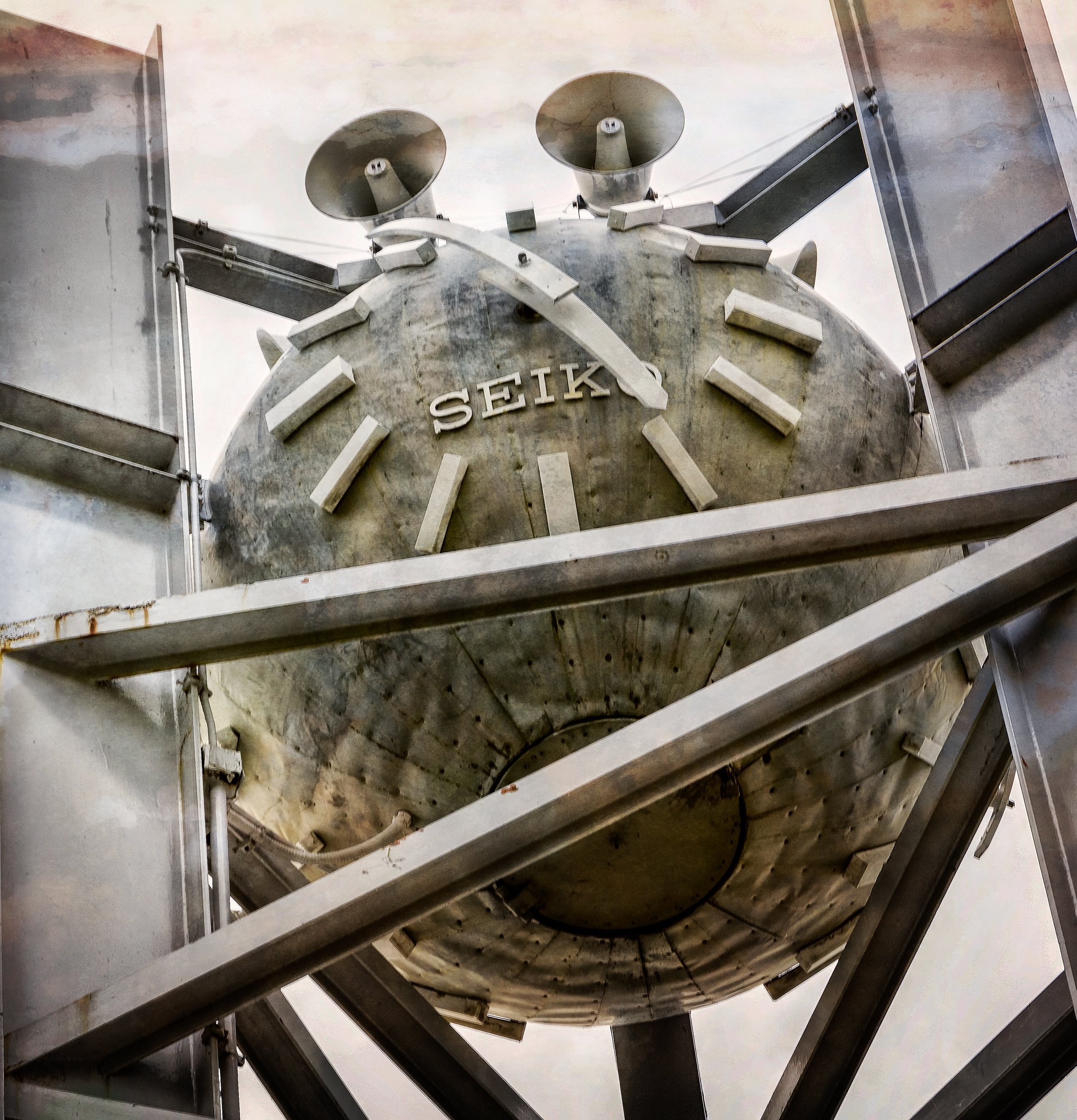You might consider using a different, or no, texture on the steel girders than the one used for the sky. I think allowing the texture to cover both background and foreground gives the image a more prominent "applied texture" effect and also reduces depth.