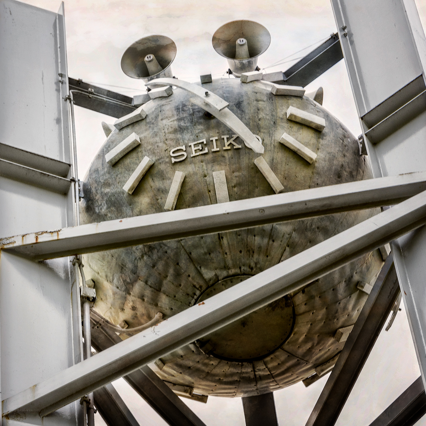 You might consider using a different, or no, texture on the steel girders than the one used for the sky. I think allowing the texture to cover both background and foreground gives the image a more prominent "applied texture" effect and also reduces depth.