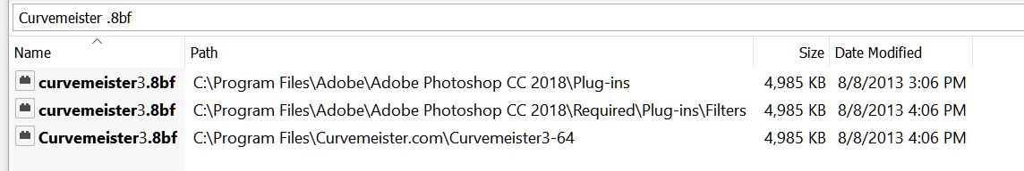 Once you find them check the file size. Your install appears to be corrupted. if you can find both try to copy the one from the Curvemeister folder over the one in the Photoshop folder. if that does not work we can get Mike Russell involved in trouble shooting your install.
